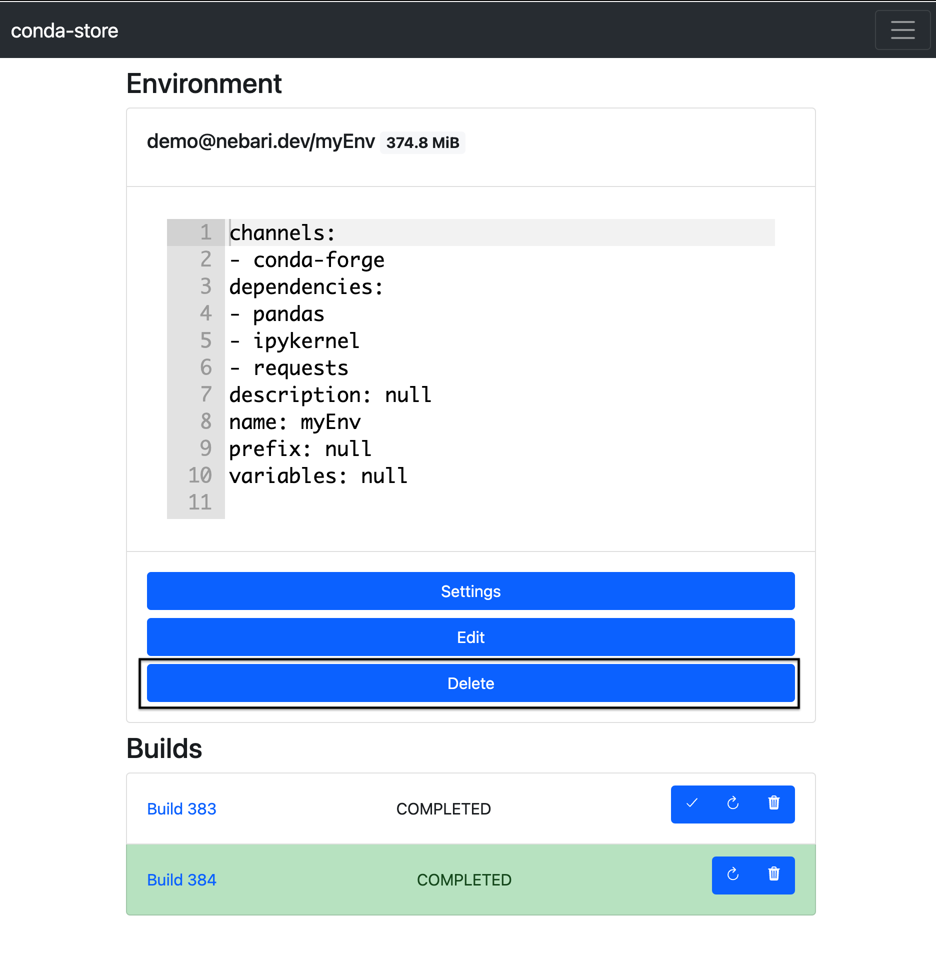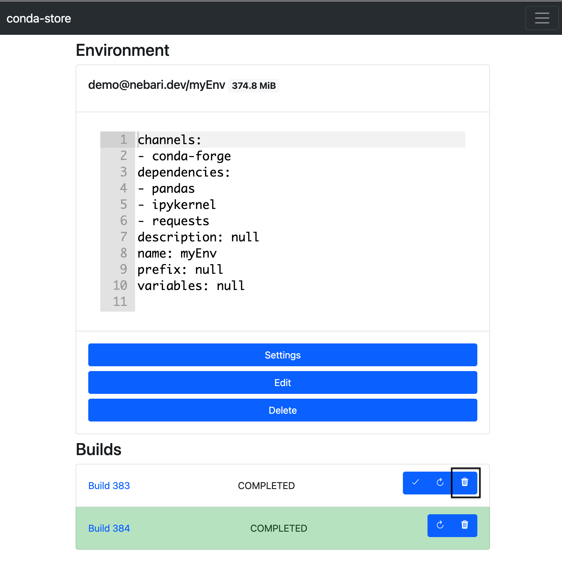 Please be patient as conda-store deletes the build, environment or namespace as it can take up to 30 minutes for these changes to propagate.